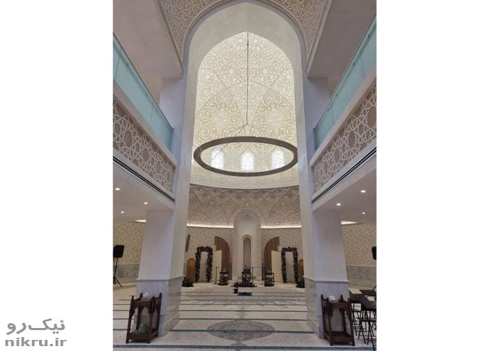 در اجرای گچ بری، نقوش و آیات این مجموعه بیش از ۵۴ هزار ساعت نفر شامل یک هزار متر مربع کار گچبری با دست در شبستان ها و رواق ها و همچنین ۳۵۰ متر مربع گچبری منحصر به فرد در زیر گنبد شبستان اصلی توسط استادکاران خبره انجام پذیرفته که به مدت ۴ سال به صورت مداوم مشغول فعالیت بوده اند.